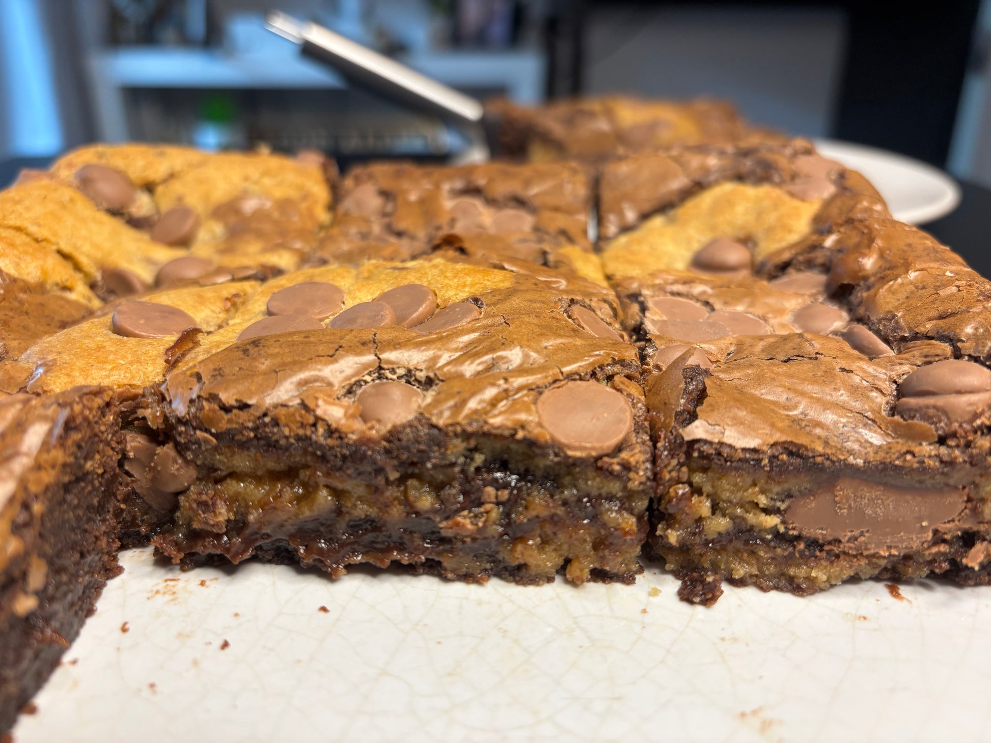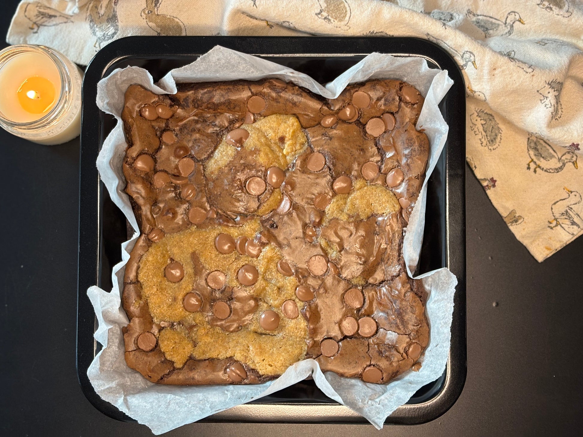 Layers of rich, fudgy brownie and soft cookie dough come together in one decadent creation. Each bite is a perfect balance of deep cocoa flavor and sweet, melty chocolate chunks. Baked in a thick 18 cm tray, it’s gooey on the inside and slightly crisp on the edges. The perfect comfort dessert for when you can’t decide between a brownie or a cookie — so you have both.